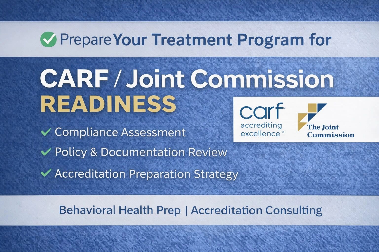 We help programs prepare for CARF and Joint Commission accreditation, strengthen documentation practices, develop and implement policies, support startup programs, and improve payer compliance.